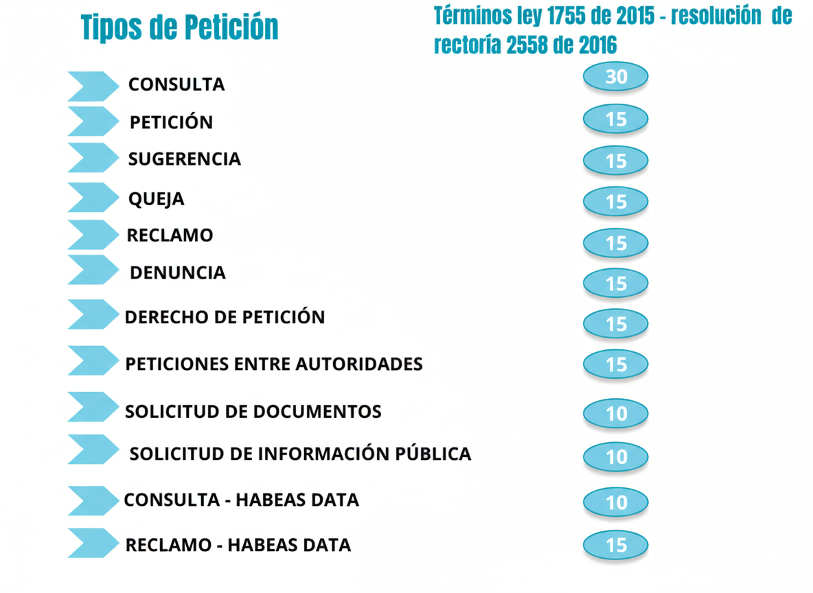 Para facilitar la atención de las PQRSD, a continuación, se informan los términos legales vigentes en días hábiles contados a partir del día siguiente a la fecha de recepción de la solicitud: