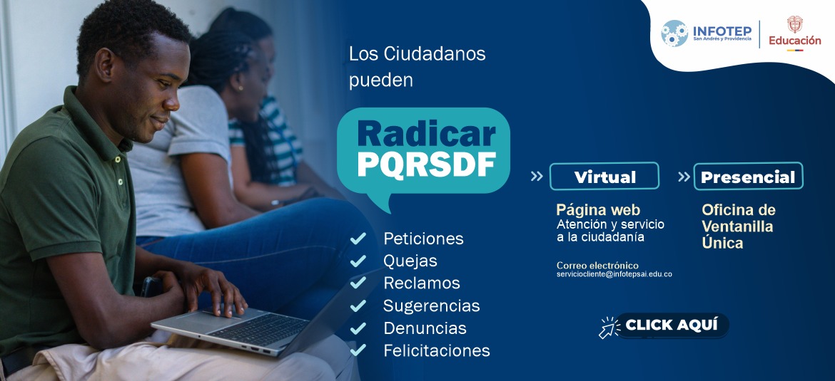 El Instituto Nacional de Formación Técnica Profesional de San Andrés y Providencia, como parte de su compromiso con la calidad institucional y el mejoramiento continuo, pone a disposición de la comunidad institucional y ciudadanía en general el programa de Peticiones, Quejas, Reclamos, Sugerencias y Denuncias PQRSD. A través del cual se pueden manifestar las opiniones respecto al cumplimiento de la misión de la institución, la calidad de los servicios ofrecidos y las actuaciones de sus funcionarios.
